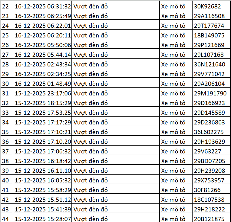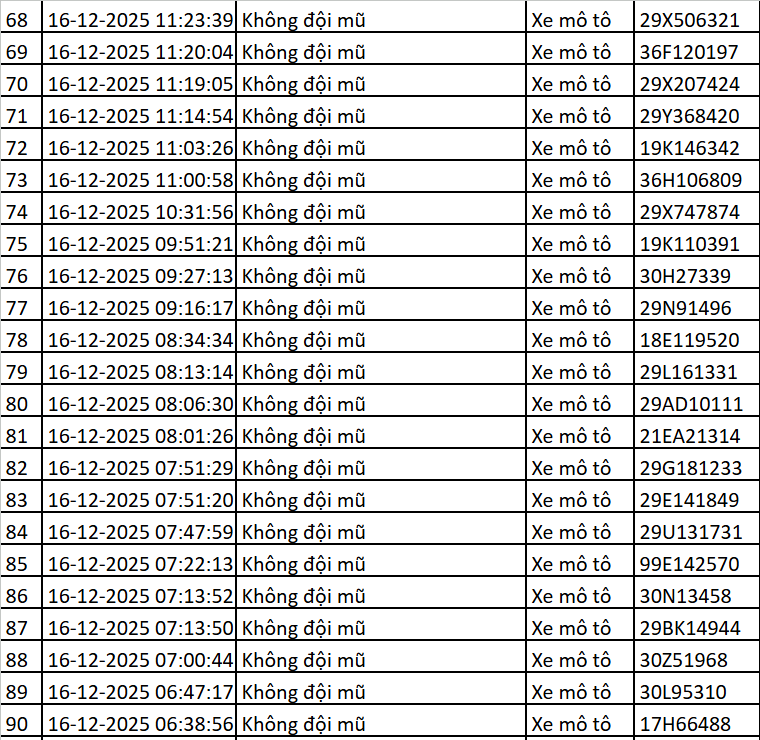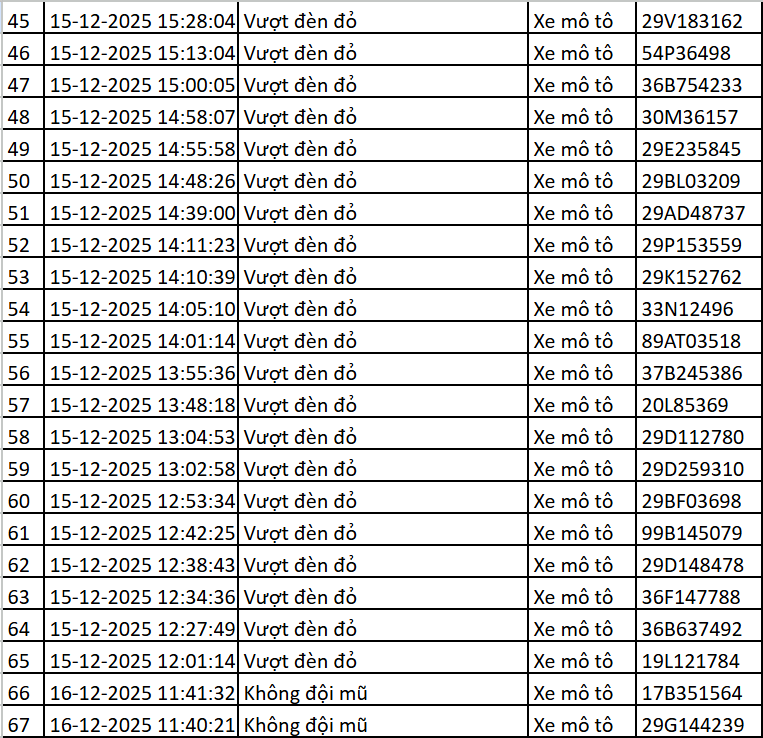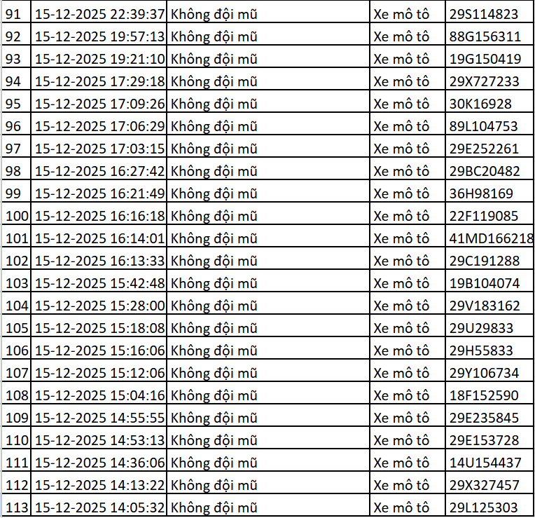 Cục Cảnh sát Giao thông mới đây đã công bố danh sách 119 trường hợp vi phạm giao thông được phát hiện thông qua hệ thống camera AI trong khoảng thời gian từ ngày 15/12 đến 16/12. Các lỗi vi phạm chủ yếu gồm: