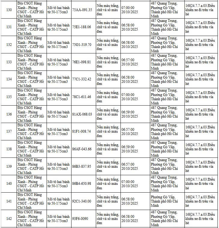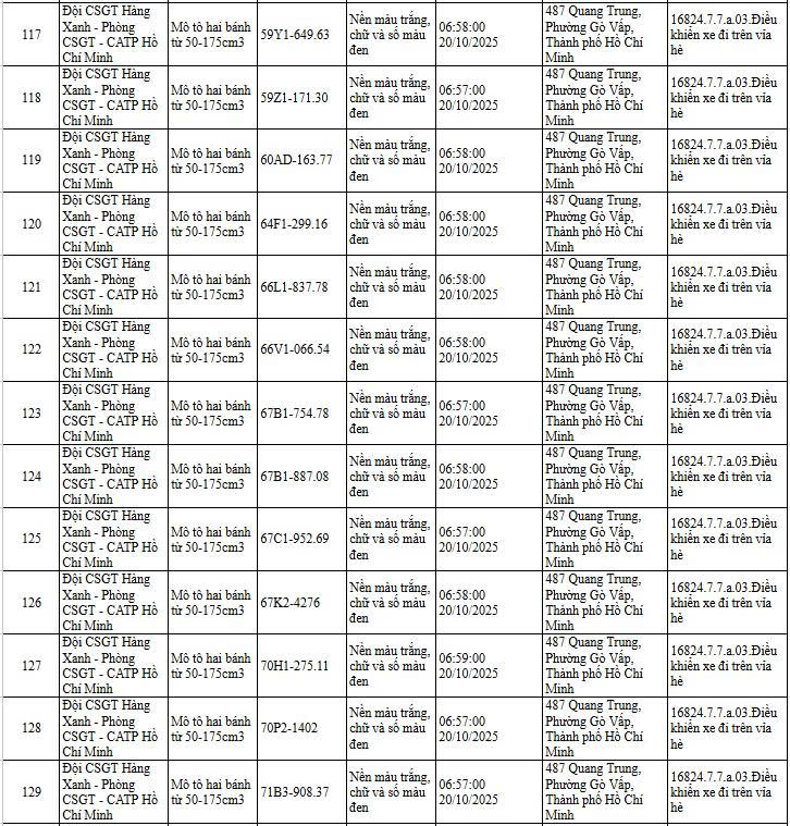Danh sách các phương tiện bị phạt nguội lỗi điều khiển xe đi trên vỉa hè (Ảnh: Phòng Cảnh sát Giao thông, Công an TP. Hồ Chí Minh)