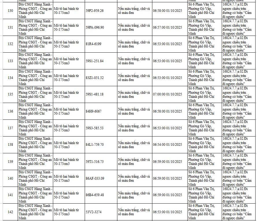 Danh sách các phương tiện bị phạt nguội lỗi đi ngược chiều (Ảnh: Phòng Cảnh sát Giao thông, Công an TP. Hồ Chí Minh)