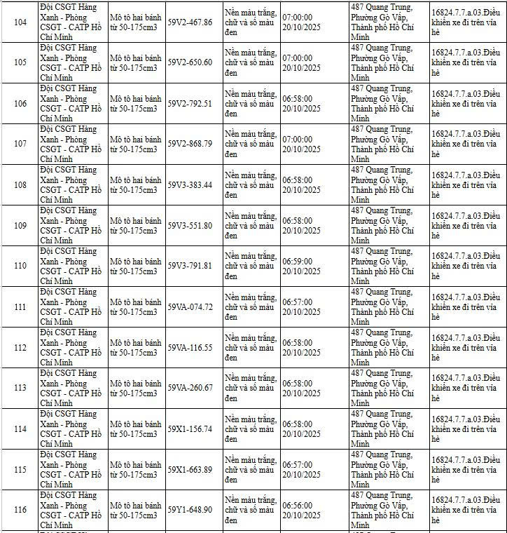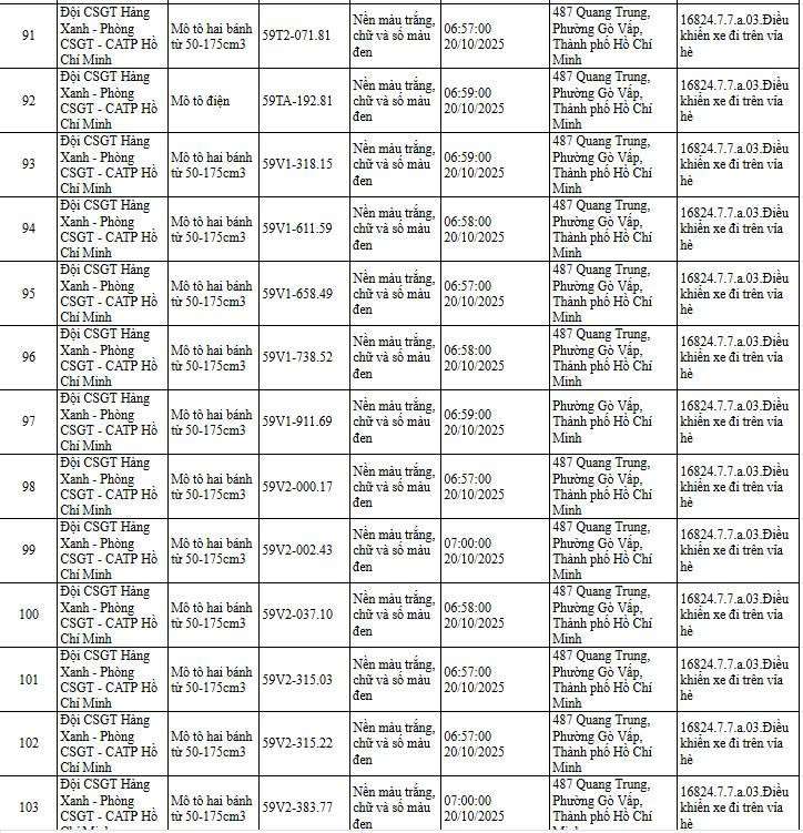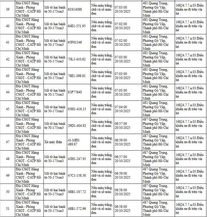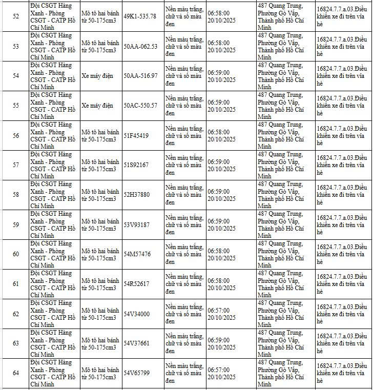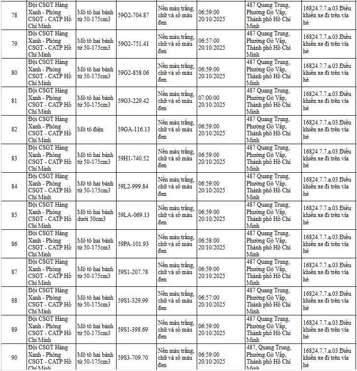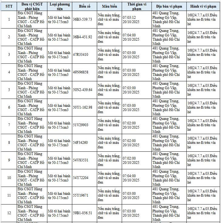 Danh sách các phương tiện bị phạt nguội lỗi điều khiển xe đi trên vỉa hè (Ảnh: Phòng Cảnh sát Giao thông, Công an TP. Hồ Chí Minh)