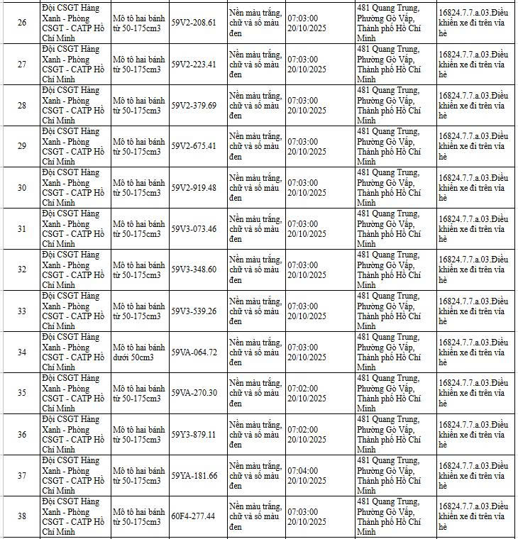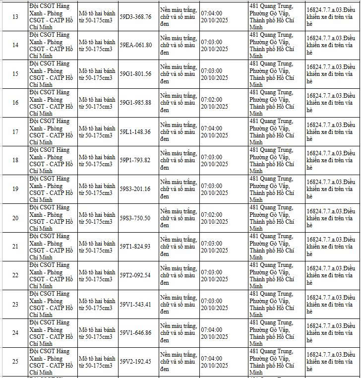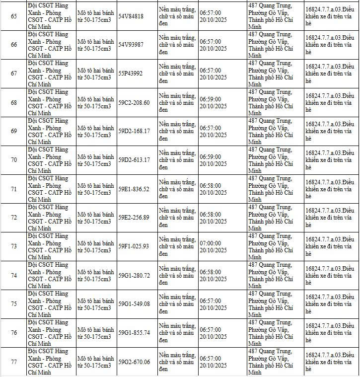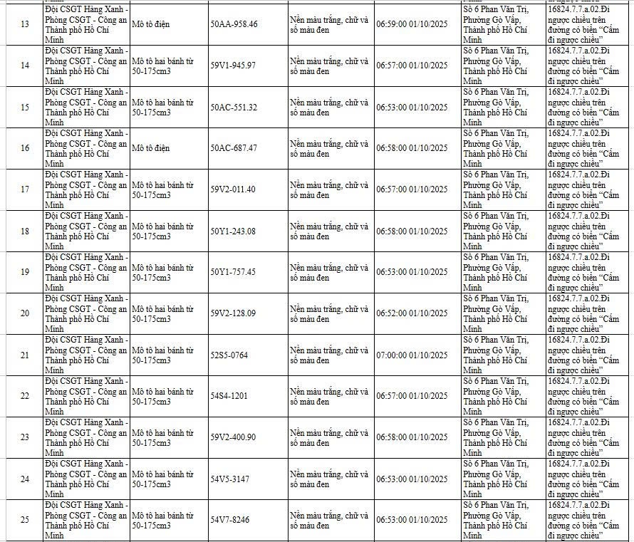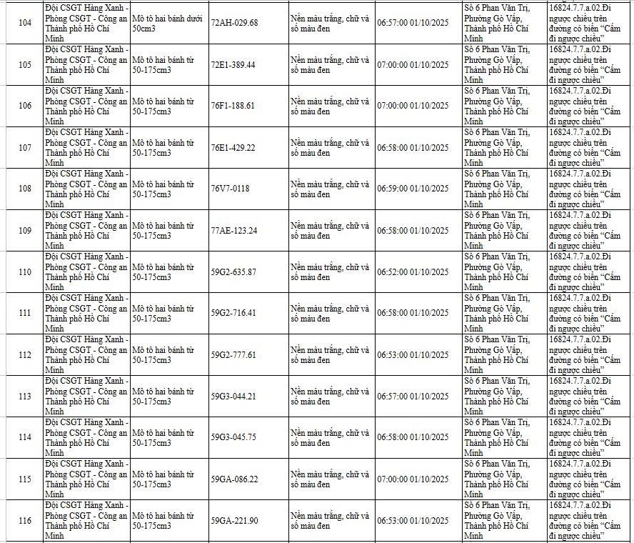 CSGT Hàng Xanh (TP.HCM) ngày 24/10 thông báo danh sách xe bị phạt nguội vì đi ngược chiều, lấn vỉa hè. Người dân nên kiểm tra thông tin và nộp phạt đúng quy định để tránh phát sinh thêm vi phạm.
