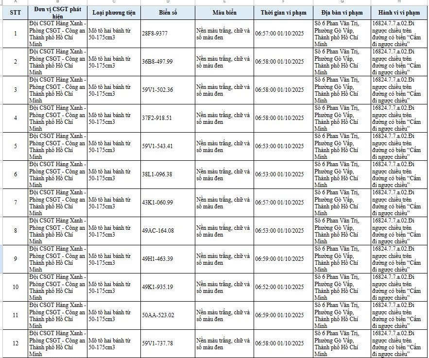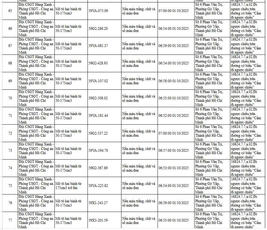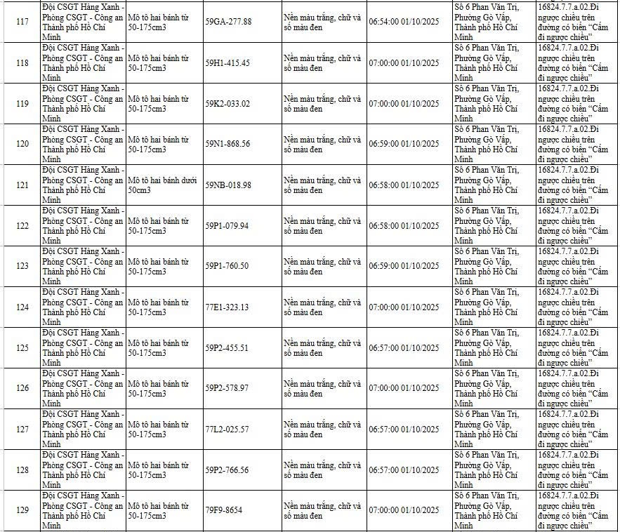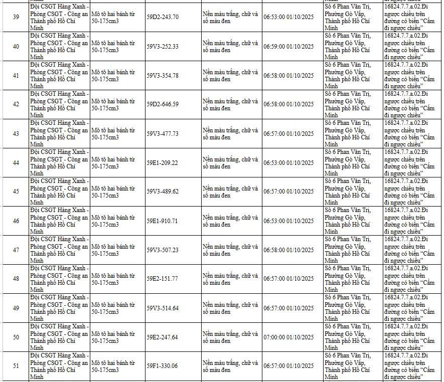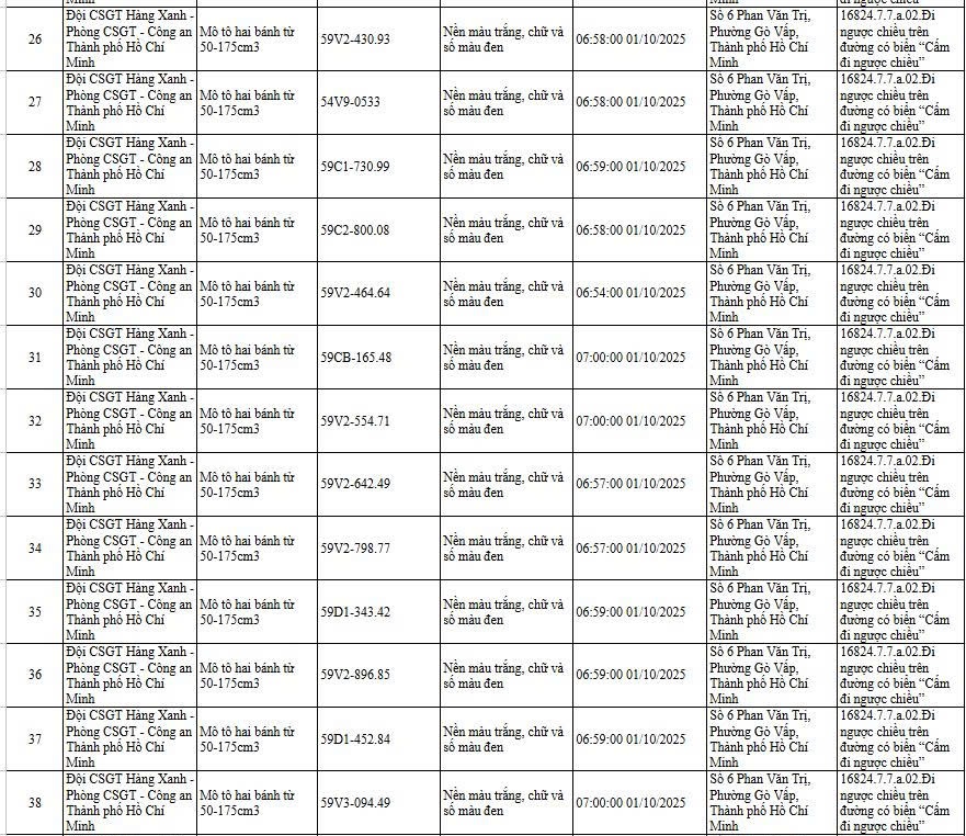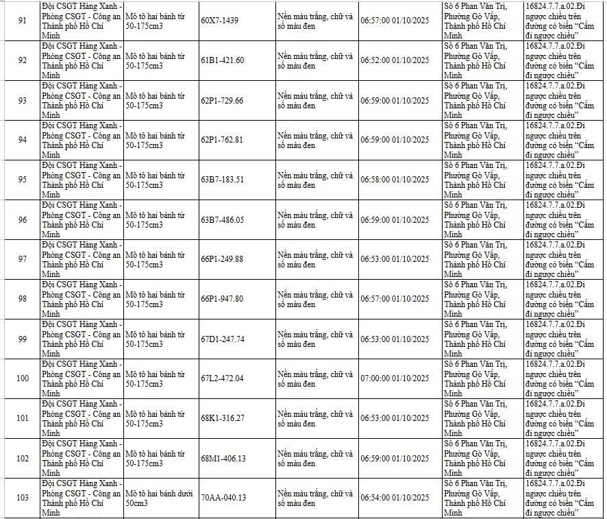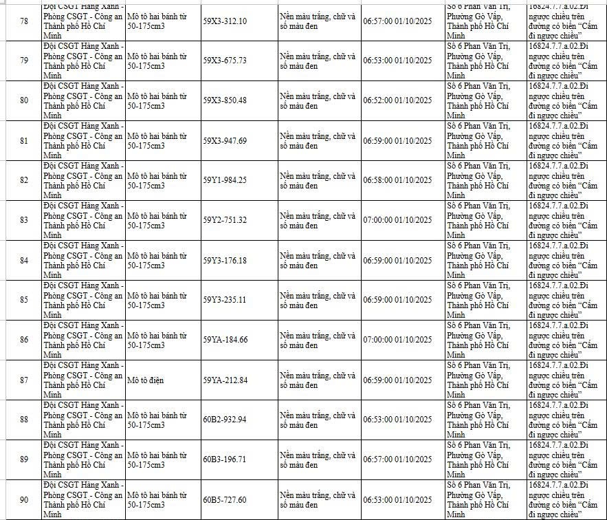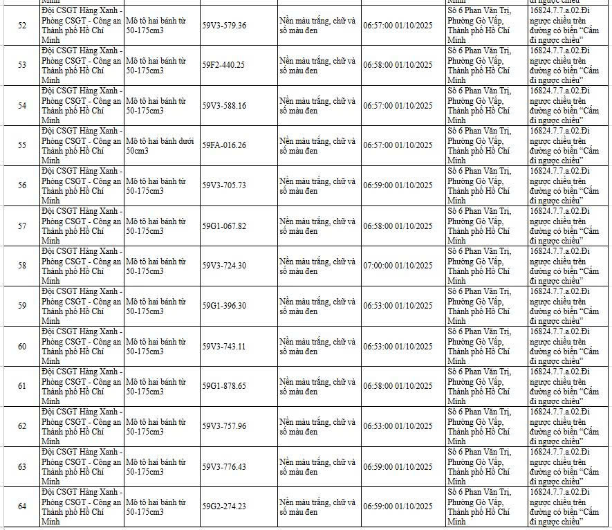 Danh sách các phương tiện bị phạt nguội lỗi đi ngược chiều (Ảnh: Phòng Cảnh sát Giao thông, Công an TP. Hồ Chí Minh)