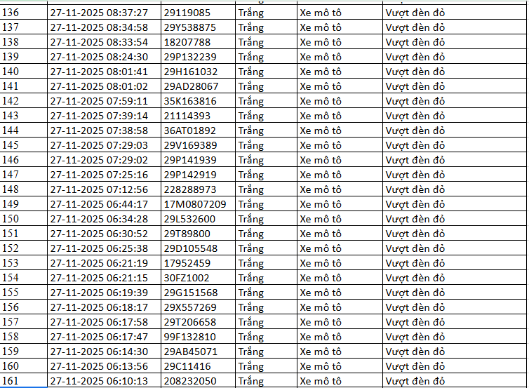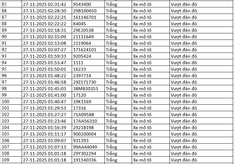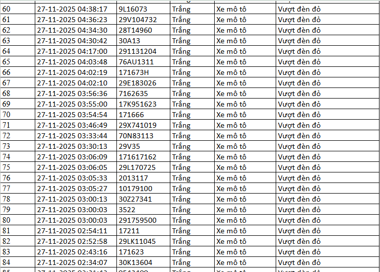 Ngày 1/12/2025, Phòng Cảnh sát giao thông – Công an tỉnh Bắc Ninh đã công bố danh sách phương tiện vi phạm được hệ thống giám sát ghi nhận trong thời gian từ 23 đến 30/11/2025, trong đó có 61 chiếc xe máy vượt đèn đỏ.