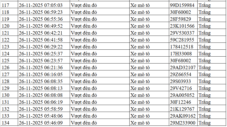 Theo Cục Cảnh sát giao thông, hệ thống camera A.I thí điểm tại nút giao Phạm Văn Bạch – Hoàng Quán Chi (Hà Nội) đã ghi nhận từ 12h ngày 26/11/2025 đến 12h ngày 27/11/2025 có 133 trường hợp xe máy không tuân thủ tín hiệu đèn – tức vượt đèn đỏ.