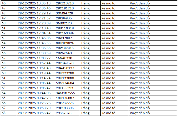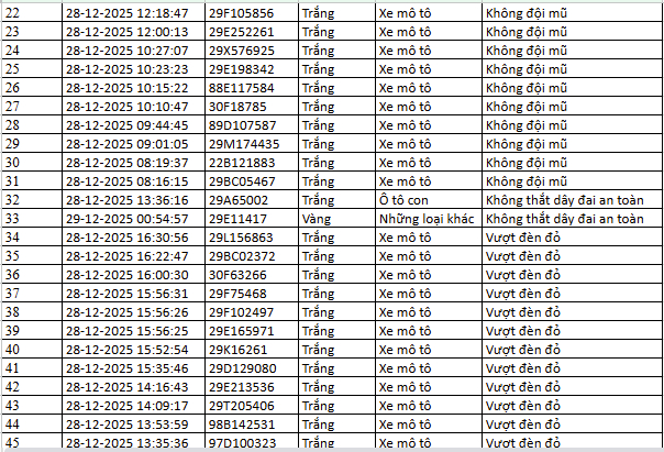 Trong vòng 24 giờ (từ 12h ngày 28/12/2025 đến 12h ngày 29/12/2025), hệ thống camera AI thí điểm của Cục Cảnh sát giao thông (CSGT) tại Hà Nội và một số tuyến cao tốc trọng điểm đã hoạt động hiệu quả, tự động ghi nhận và phát hiện nhiều trường hợp vi phạm trật tự an toàn giao thông.