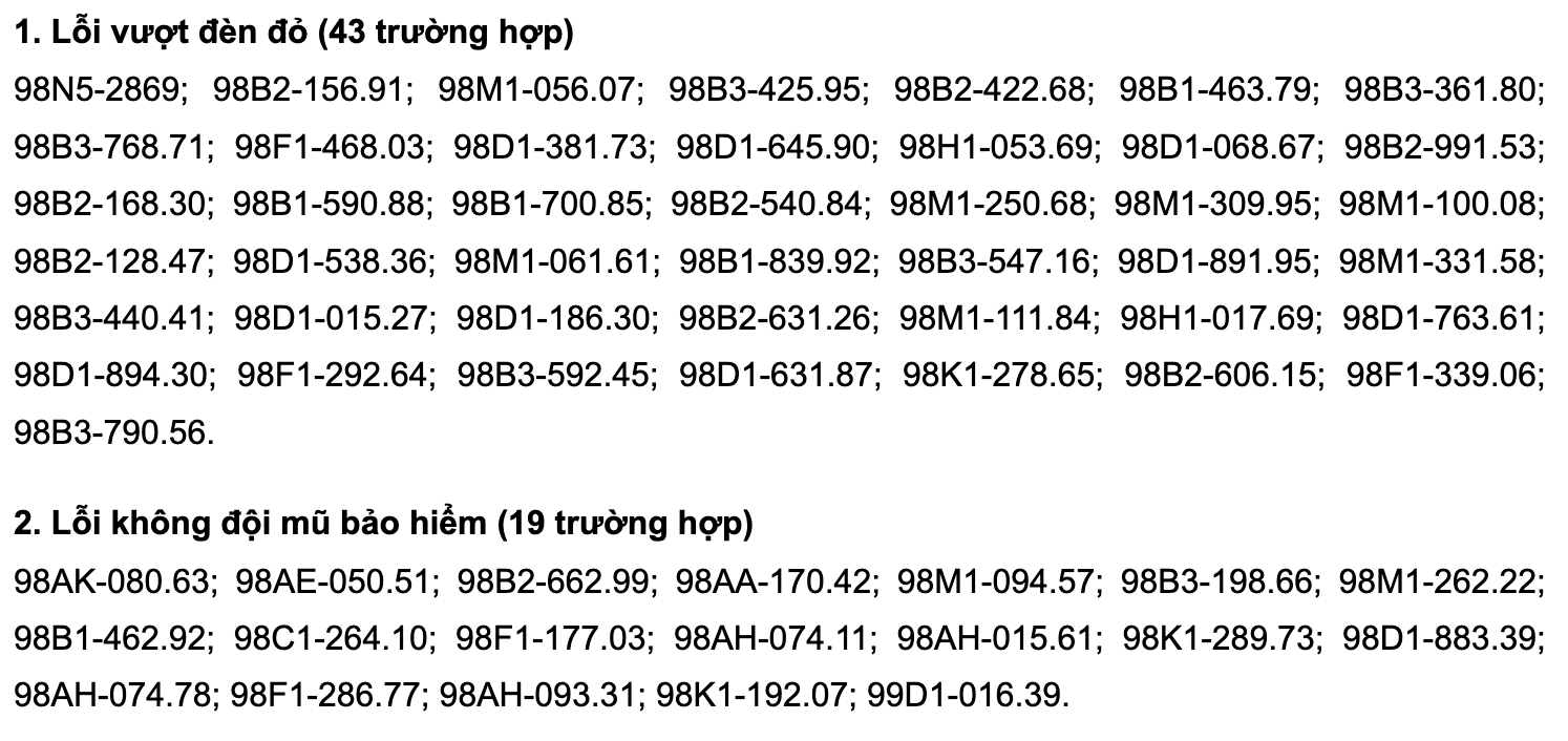 Bên cạnh đó, Phòng Cảnh sát giao thông Công an tỉnh Bắc Ninh cũng công bố danh sách hàng chục trường hợp xe máy vi phạm luật giao thông, chủ yếu là các lỗi phổ biến như không đội mũ bảo hiểm và vượt đèn đỏ. Các trường hợp này được đơn vị ghi nhận thông qua hệ thống giám sát trong khoảng thời gian từ ngày 11/7 đến ngày 17/7/2025.