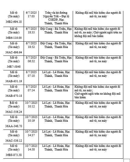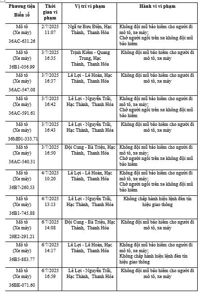 Từ ngày 1/7 đến ngày 10/7/2025, Công an tỉnh Thanh Hóa đã phát hiện 25 trường hợp bị phạt nguội, trong đó có tới 21 xe máy. Các lỗi vi phạm phổ biến nhất là điều khiển xe máy không đội mũ bảo hiểm, chở người không đội mũ bảo hiểm và không chấp hành tín hiệu đèn giao thông.