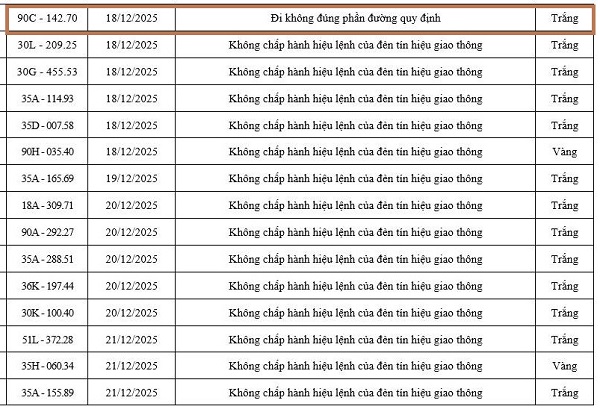 Công an tỉnh Bắc Ninh thông tin, trong khoảng thời gian từ ngày 19/12 đến 26/12/2025, lực lượng chức năng đã thực hiện phạt nguội đối với các phương tiện vi phạm lỗi lấn làn, đè vạch kẻ đường, cụ thể như sau: