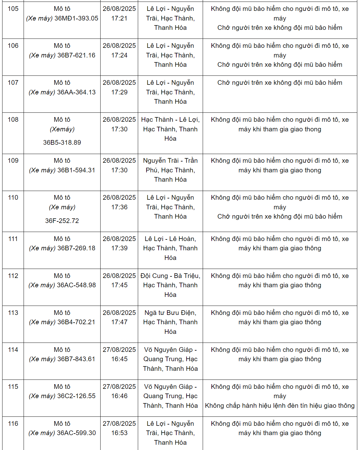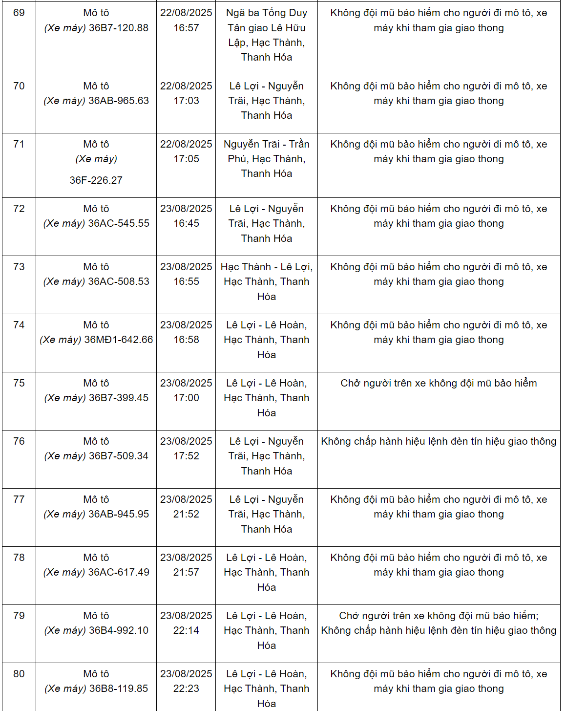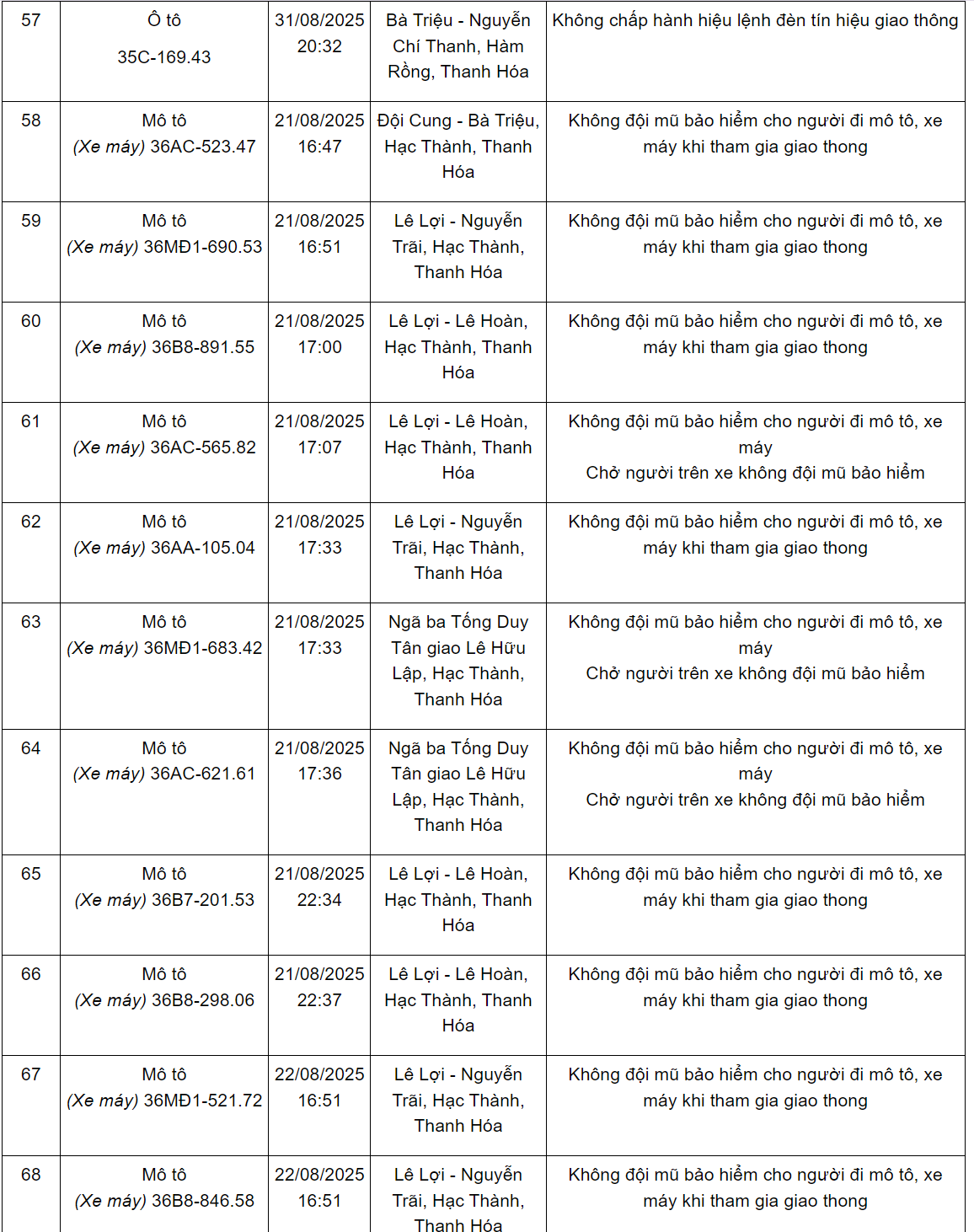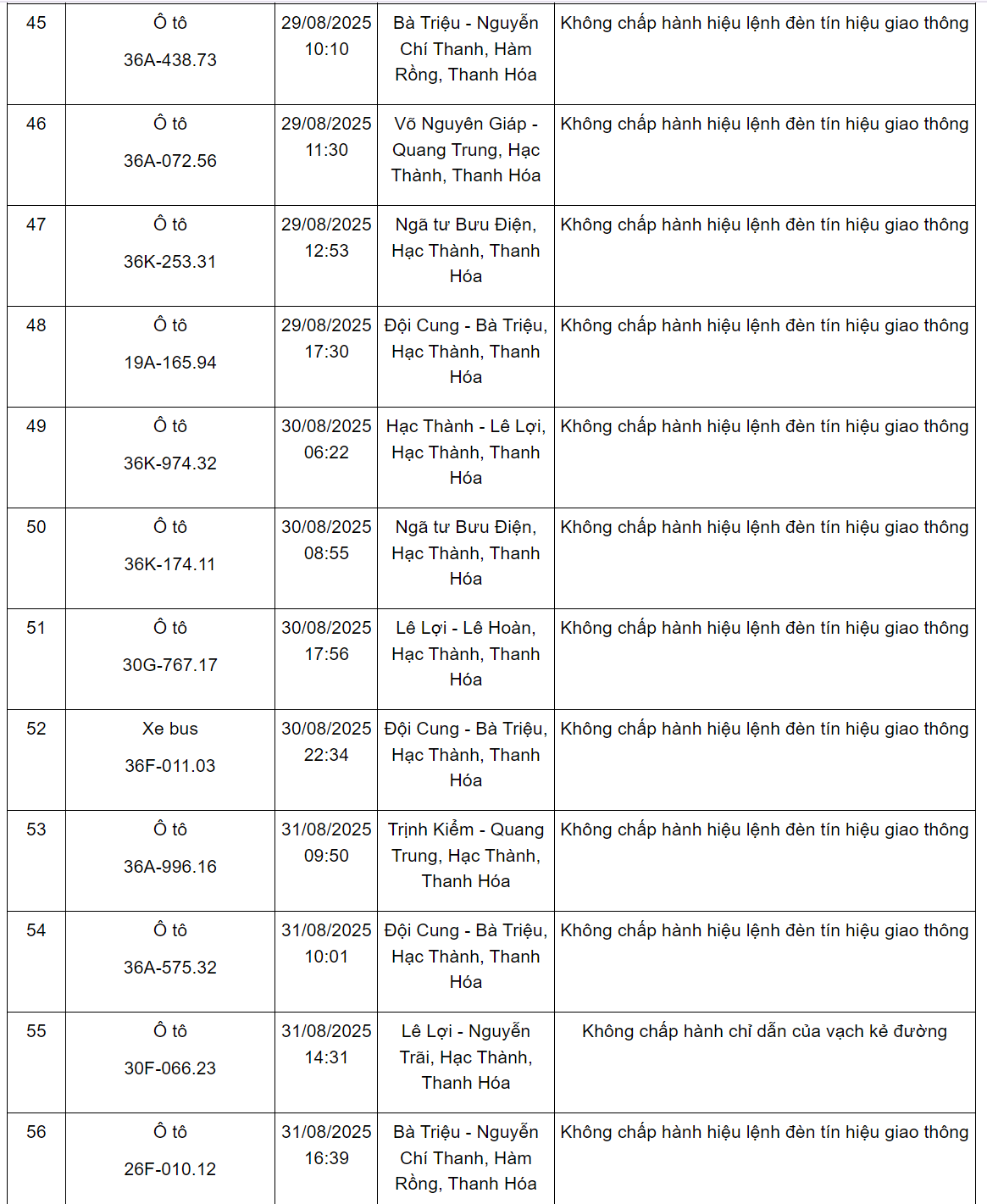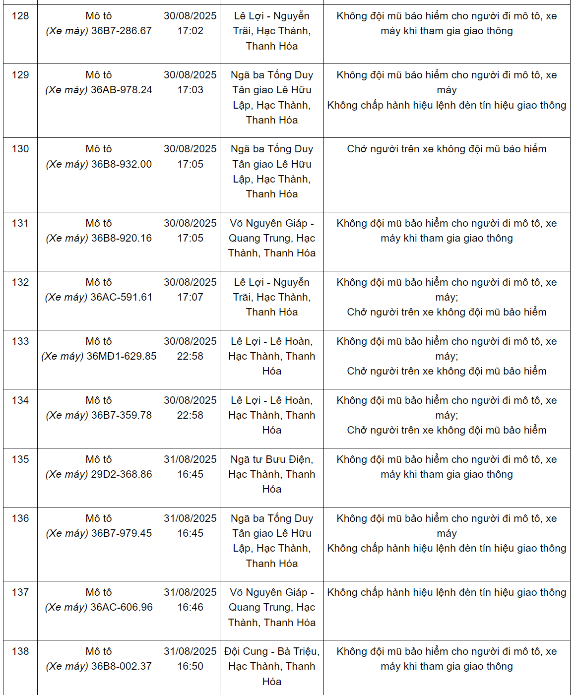 Trong khoảng thời gian từ ngày 21 đến ngày 31 tháng 8 năm 2025, lực lượng Cảnh sát Giao thông tỉnh Thanh Hóa đã phát hiện và ghi nhận nhiều trường hợp vi phạm giao thông thông qua hệ thống thiết bị nghiệp vụ. Theo thông báo mới nhất từ Phòng CSGT Công an tỉnh, đã có 144 phương tiện bị phát hiện vi phạm qua hình ảnh.