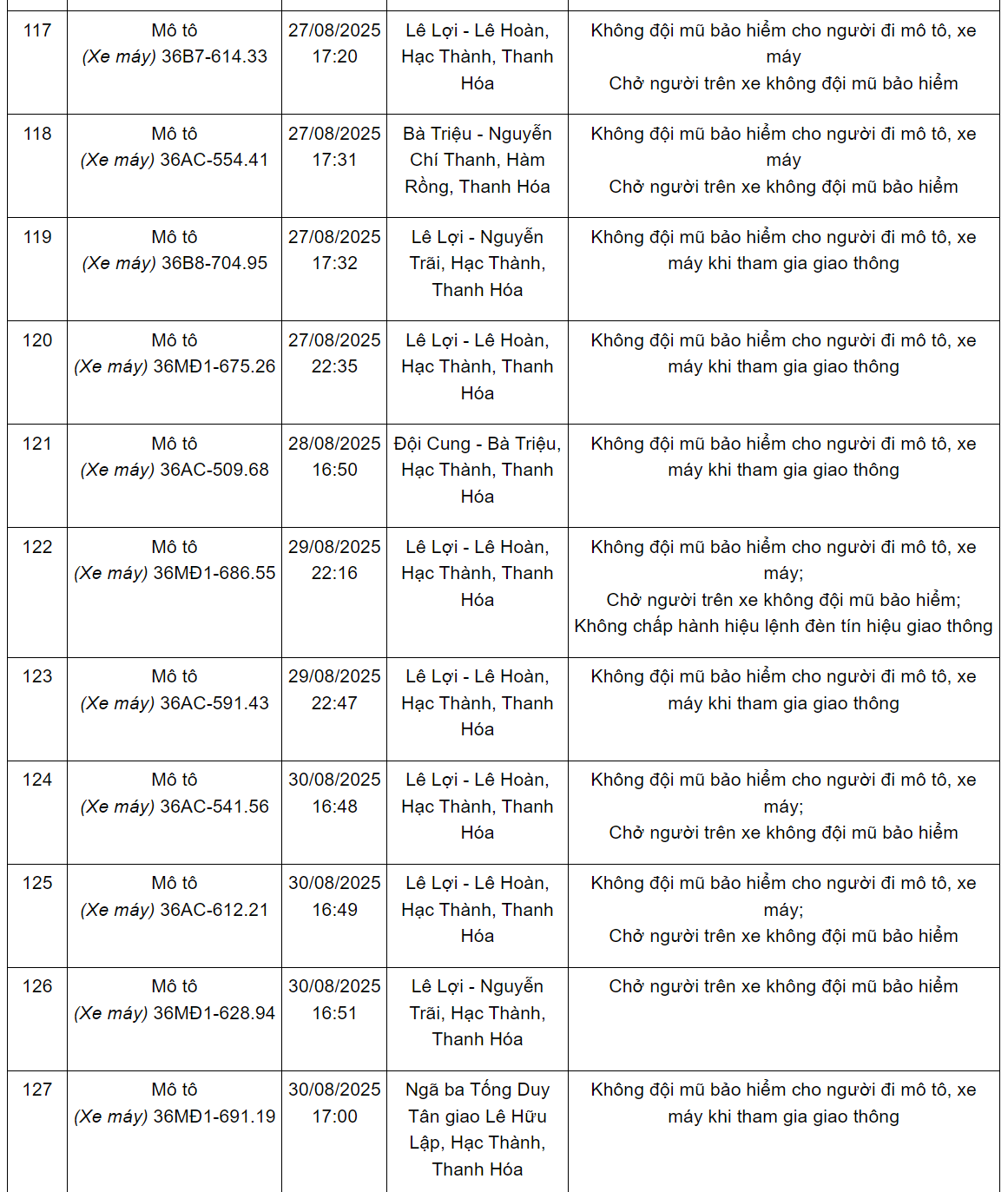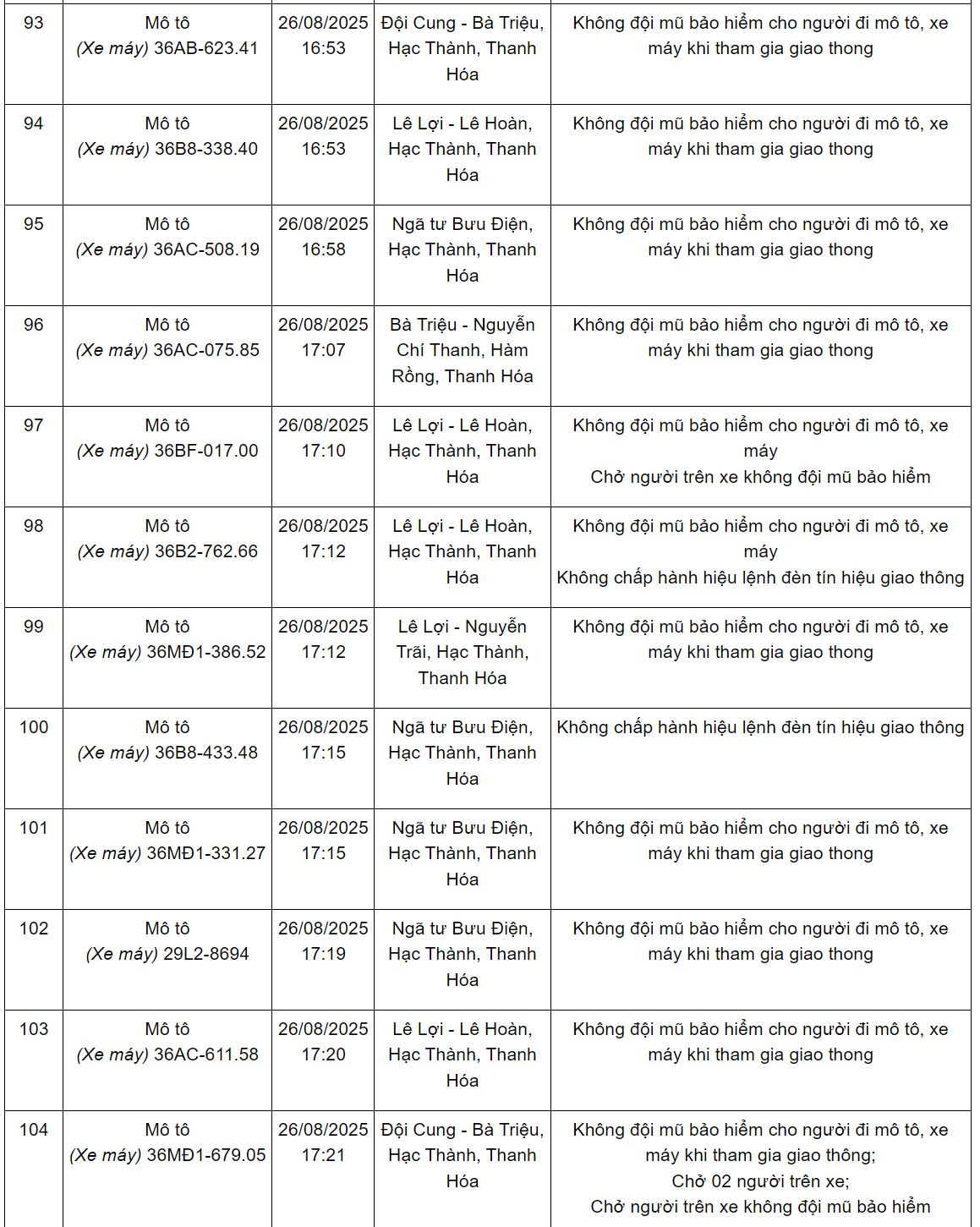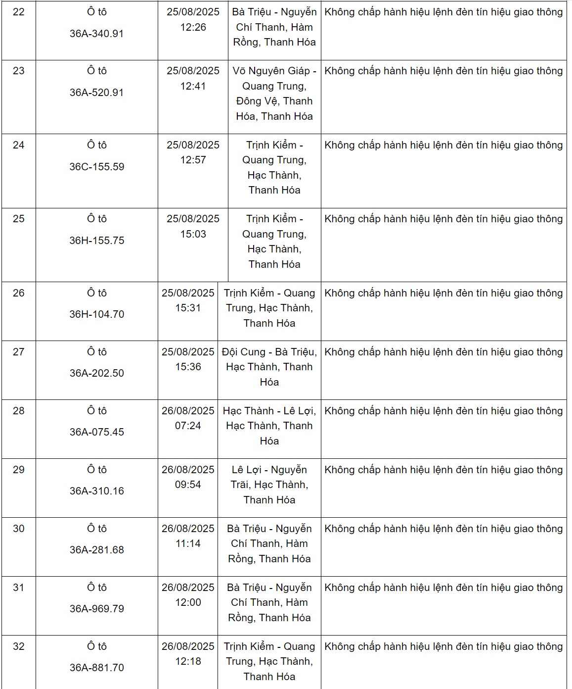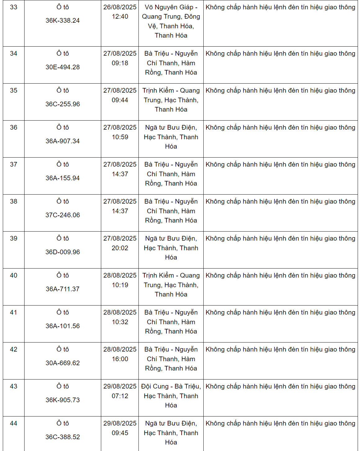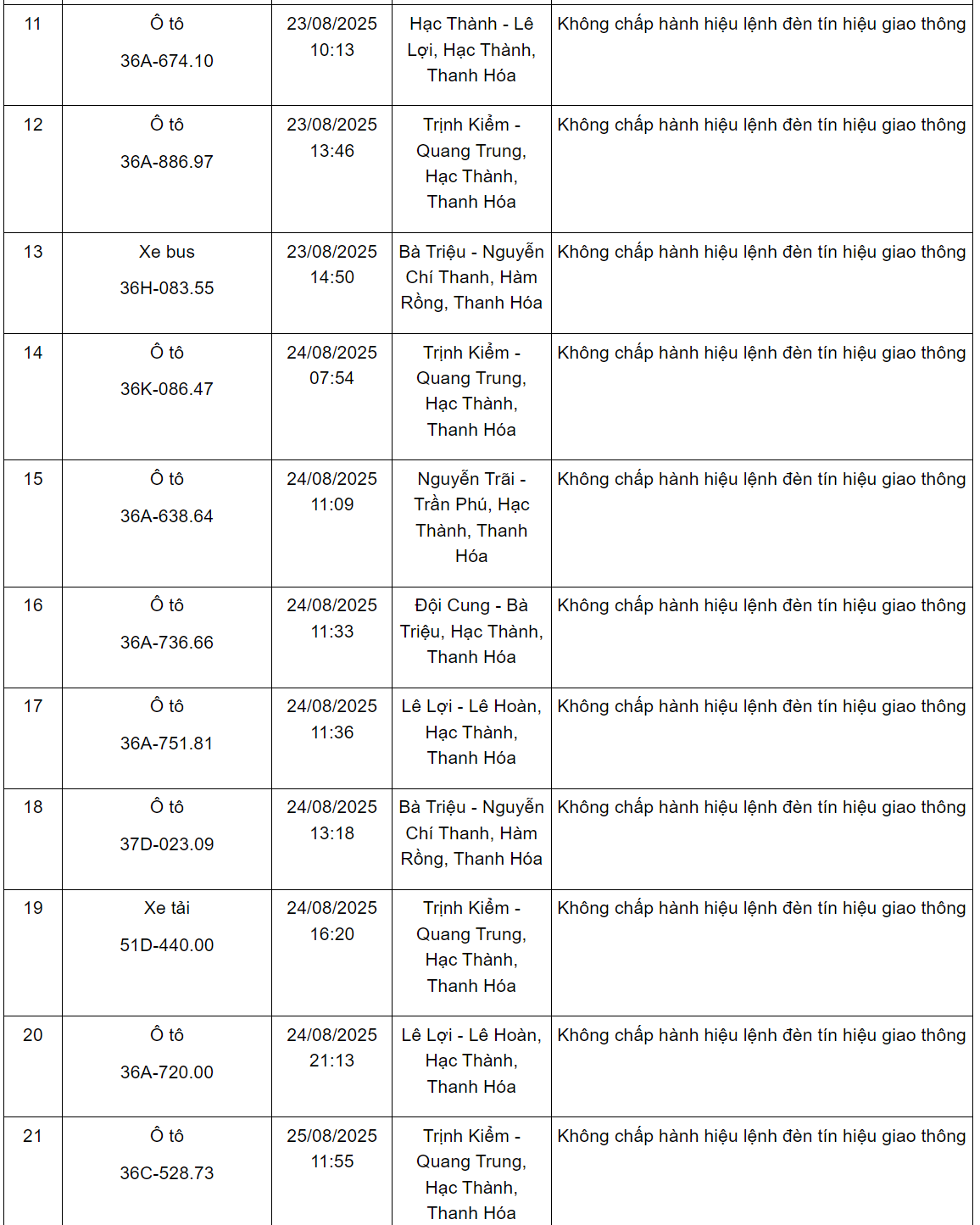 Trong khoảng thời gian từ ngày 21 đến ngày 31 tháng 8 năm 2025, lực lượng Cảnh sát Giao thông tỉnh Thanh Hóa đã phát hiện và ghi nhận nhiều trường hợp vi phạm giao thông thông qua hệ thống thiết bị nghiệp vụ. Theo thông báo mới nhất từ Phòng CSGT Công an tỉnh, đã có 144 phương tiện bị phát hiện vi phạm qua hình ảnh.