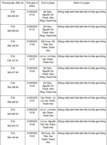 Phòng CSGT Công an Thanh Hóa phát hiện nhiều trường hợp vượt đèn đỏ qua hệ thống phạt nguội từ 21 đến 25/9/2025. Cụ thể, theo thông báo từ Phòng CSGT Công an tỉnh Thanh...
