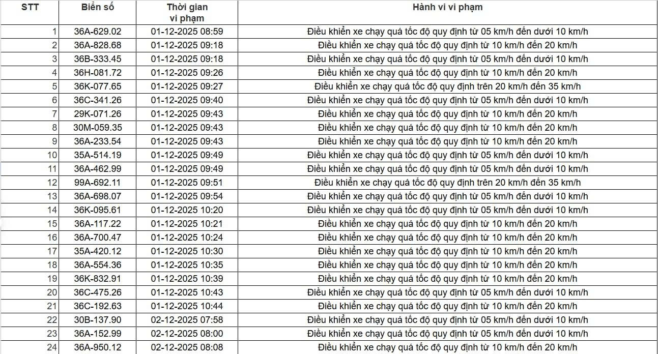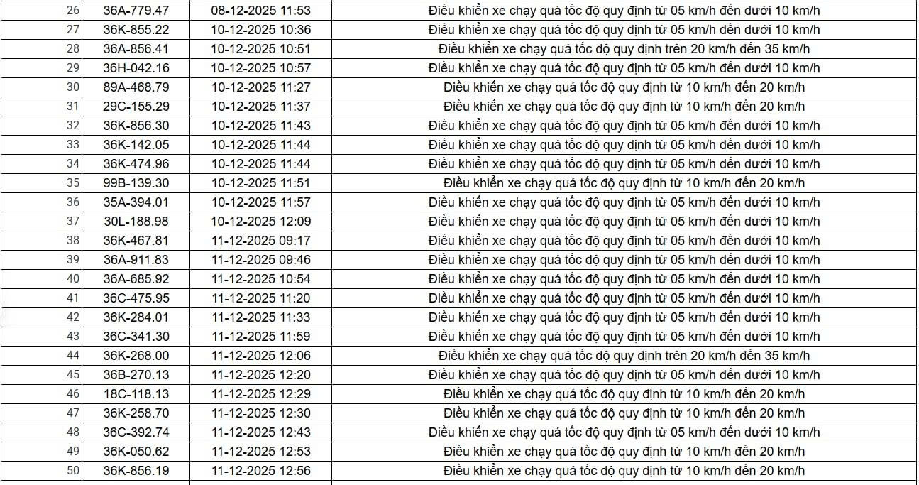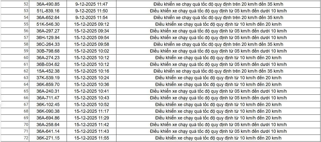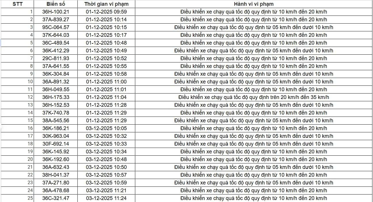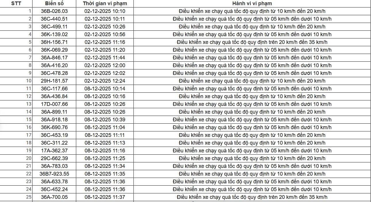 Danh sách xe vi phạm tốc độ bị phạt nguội tại Thanh Hóa đầu tháng 12/2025