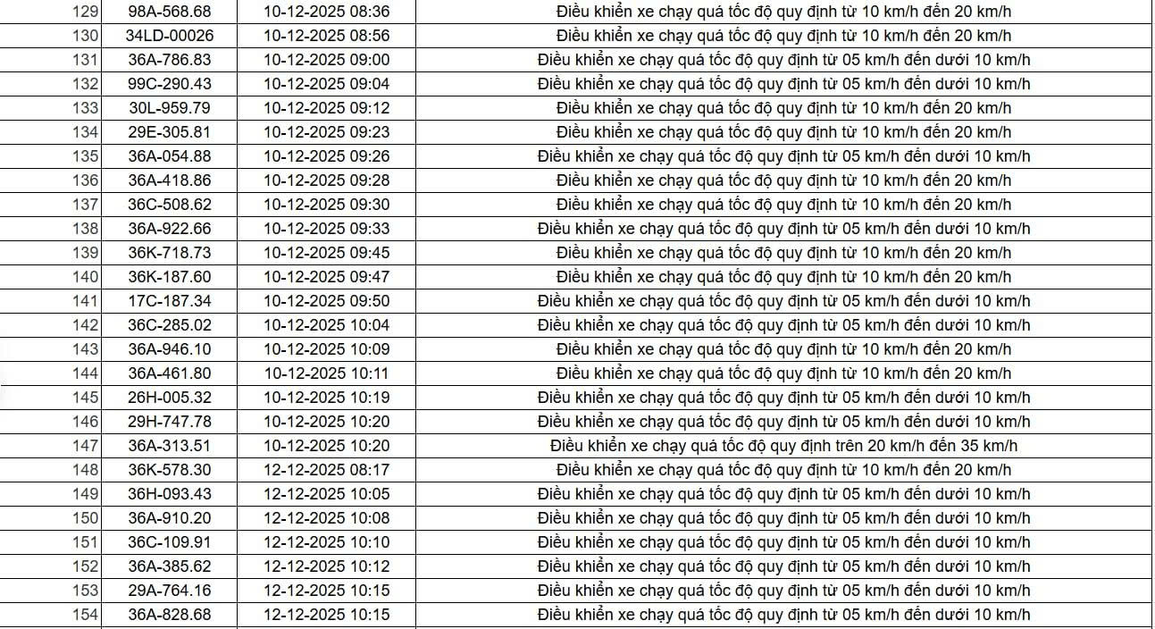 Công an tỉnh Thanh Hóa vừa công bố danh sách các phương tiện vi phạm tốc độ bị xử phạt nguội trong thời gian đầu tháng 12/2025. Các trường hợp vi phạm được ghi nhận trên nhiều tuyến đường trọng điểm như Quốc lộ 1, Quốc lộ 45, Quốc lộ 47, Quốc lộ 47B và đường Hồ Chí Minh.
